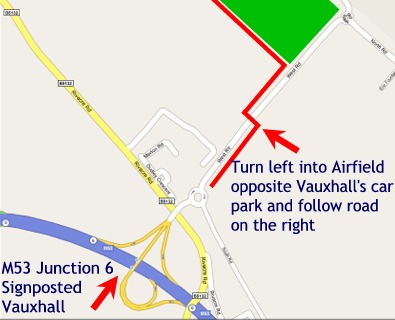 The circuit can be found by taking Junction 6 on the M53 motorway, signposted "Vauxhalls". Follow the exit to the mini roundabout, go straight across the roundabout. After the roundabout follow West road for 100 yards then take the left turn into the Hooton Airfield, opposite the Vauxhalls car park. Turn immediately right after the airfield gates and follow the road around to the track